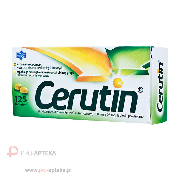 Cerutin to preparat o skojarzonym działaniu rutozydu i witaminy C (Jedna tabletka powlekana zawiera 100 mg kwasu askorbinowego i 25 mg rutozydu trójwodnego). Oba składniki zmniejszają przepuszczalność naczyń krwionośnych, wzmacniając ich ściany. Rutozyd przedłuża działanie witaminy C, opóźniając jej utlenianie. Cerutin jest skuteczny zarówno w profilaktyce jak i w leczeniu wspomagającym przeziębień i grypy.